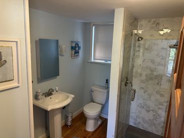The newly renovated bathroom has a brand-new stand-up shower plus soaps, shampoo, and conditioner are all provided!